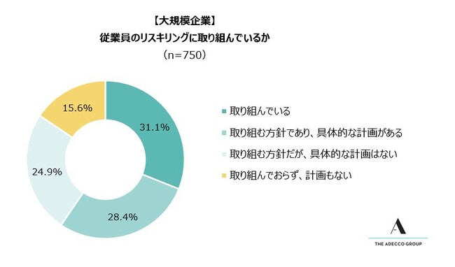 日本全国の人事担当者1,500人に対し、「あなたの勤務先では、従業員のリスキリングに取り組んでいますか?」と質問したところ、大規模企業所属(従業員数1,000人以上の企業)の人事担当者の31.1%が「取り組んでいる」と回答しました。また、28.4%が「取り組む方針であり、具体的な計画がある」、24.9%が「取り組む方針だが、具体的な計画はない」と回答しました。