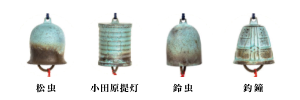 「箱根風鈴まつり」では4種類の形の風鈴(松虫・小田原提灯・鈴虫・釣鐘)を飾り付けています。形によってそれぞれ異なる音色が織りなすハーモニーをお楽しみください。