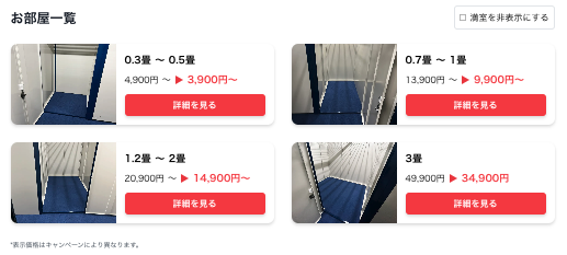 部屋タイプとサイズ、月額料金はこちら