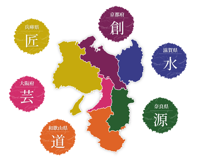滋賀県・・・水、兵庫県・・・匠、京都府・・・創、奈良県・・・源、和歌山県・・道、大阪府・・・芸