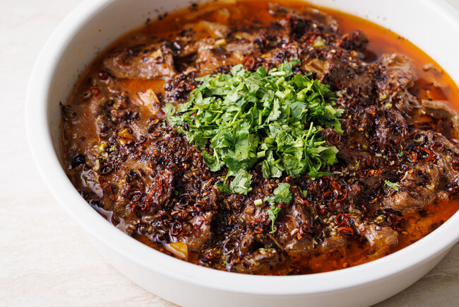中華シェフ一押しのスパイシー料理。柔らかい牛肉の食感とジワジワくる辛さ。じっくり煮込まれた牛肉に染みたシビレが癖になること間違いなし!知る人ぞ知る四川料理の定番です。