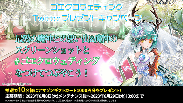 「#ゴエクロウェディング」をつけて投稿していただいた方の中から抽選でAmazonギフトカード1000円分と魔神からのメッセージを10名様にプレゼントします。