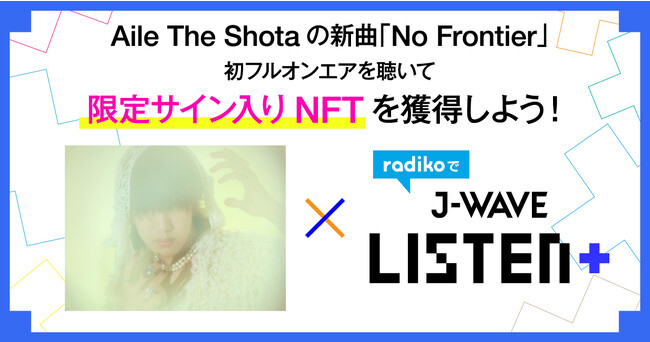 ラジオ局J-WAVE(81.3FM)では、リスナー向けWEB3サービス「J-WAVE LISTEN+(リッスン・プラス)」の新企画として、BMSGレーベル・Aile The Shotaとのコラボレーション企画「J-WAVE LISTEN+ CHALLENGE」を実施いたします。J-WAVEで初フルオンエア解禁されるAile The Shotaの新曲「No Frontier」をradikoアプリ、J-WAVEアプリまたはJ-WAVEサイトから聴いた人に、J-WAVEとAile The Shotaのコラボレーション・デジタルステッカー(NFT)をプレゼントするというものです。
