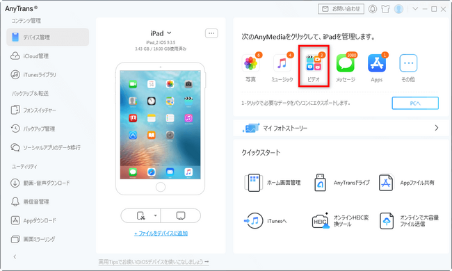 ステップ1、AnyTransを起動し、iPadを接続して、識別されたら右上の「ビデオ」をクリックします。