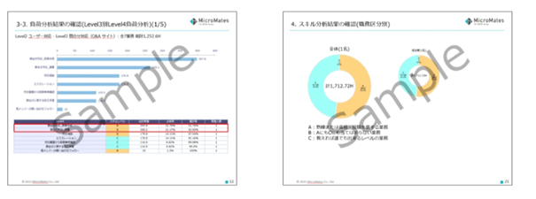 ドキュメント作成をサービスの主軸にするマイクロメイツだからこそ実現できる、「見やすいレポート」を提供します。業務負荷・スキルレベル・属人化・コストの4つの視点から業務別、個人別に分析し、視覚的にアウトプットを行います。