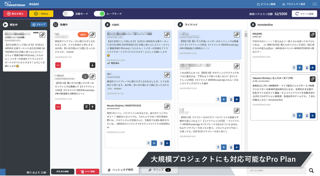 2023年6月26日(月)、Webと映像のプロダクション・カンパニーである株式会社MONSTER DIVE(モンスターダイブ/本社:東京都港区、代表取締役:岡島将人/以下、当社)は、SNSキュレーション・ライブ・システム『TweetVision』(ツイートビジョン)においてプロフェッショナル向け新プラン「TweetVision Pro Plan」(以下、Pro Plan)の販売を開始しました。
