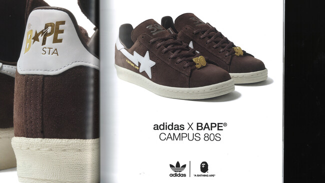 特徴的なデザインで世界中に知られるBAPE(R)が、Campus 80sのシルエットをアップデート。チョコレートブラウンのスエードアッパー、側面にはスリーストライプスとA BATHING APE(R)のロゴ、トレフォイルとBAPE STAのヒールタブを配しました。