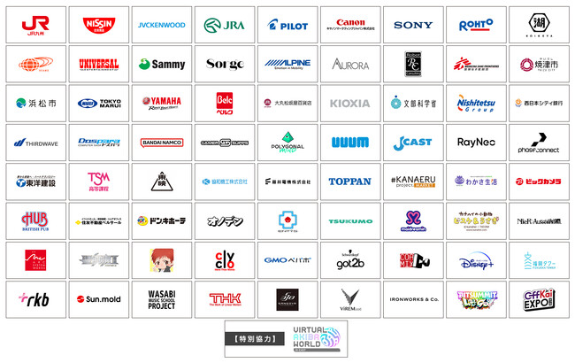 九州旅客鉄道株式会社/日清食品株式会社/株式会社JVCケンウッド/日本中央競馬会(JRA)/株式会社パイロットコーポレーション/キヤノンマーケティングジャパン株式会社/ソニー株式会社/ロート製薬株式会社/株式会社湖池屋/株式会社ビームス/株式会社ユニバーサルエンターテインメント/サミー株式会社/Sorge/アルパインマーケティング株式会社/オーロラ株式会社/株式会社Robot Consulting/特定非営利活動法人 国境なき医師団日本/静岡県焼津市/静岡県浜松市/株式会社東京マルイ/ヤマハ発動機株式会社/株式会社ベルク/株式会社大丸松坂屋百貨店/キオクシア株式会社/文部科学省/西日本鉄道株式会社/株式会社西日本シティ銀行/株式会社サードウェーブ/ドスパラ/バンダイナムコミュージックライブ/ゲーマーサップス(Gamer Supps(R))/ポリゴナルマインド/UUUM株式会社/株式会社ジェイ・キャスト/TCL RayNeo/Phase Connect/東洋建設株式会社/SO.ON project LaV 東京スクールオブミュージック&ダンス専門学校/東映株式会社/協和機工株式会社/藤井電機株式会社/凸版印刷株式会社/かなプロマーケット/株式会社わかさ生活/株式会社ビックカメラ/株式会社ハブ/住友不動産ベルサール株式会社/株式会社パン・パシフィック・インターナショナルホールディングス/株式会社オノデン/秋葉原エンタス/TSUKUMO/めいどりーみん/カナヘイの小動物/NieR:Automata/アークシステムワークス株式会社/聖飢魔II/赤髮のとも/合同会社クリクロ/GMOペパボ株式会社/Schwarzkopf got2b/コアミックス/ディズニープラス/福岡タワー/RKB毎日放送株式会社/日本サンモルド株式会社/山葵音楽学校プロジェクト/THK株式会社/株式会社三五屋/合同会社ViREM/有限会社アイアンワークス/BitSummit/OffKai Expo