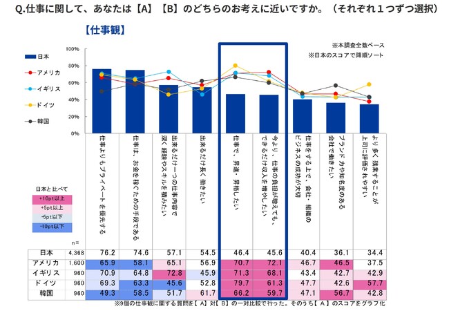 日本は4人中3人が「仕事よりもプライベート優先」「仕事はあくまでお金を稼ぐため」と回答し、5ヵ国中1位。「仕事で、昇進・昇格したい」はドイツが79.7%で最も高く、アメリカ・イギリス・韓国でも7割前後である一方、日本は46.4%で最下位。