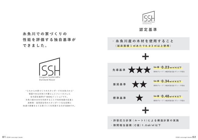 制度概要については、一定以上の糸魚川産木材の使用、許容応力度計算での構造計算の実施、隙間相当面積の取り決め、これらに加えて3段階のUa値をの達成度で★一つから★三つまでの認定を住宅に付与します。