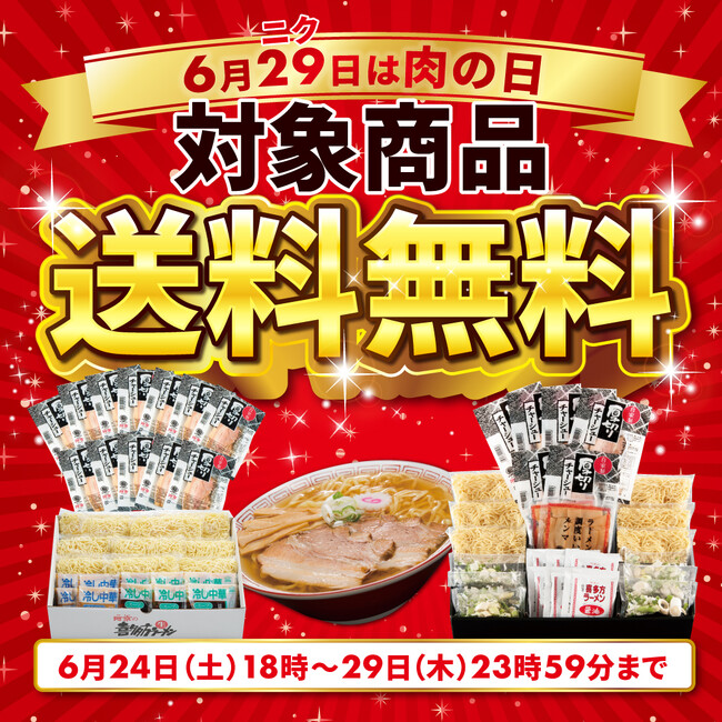 『肉の日』に良い肉を味わっていただきたいという想いから、肉の日にちなみ6月29日(木)23時59分まで、チャーシュー付き対象商品6品を送料無料キャンペーンを開催します。
