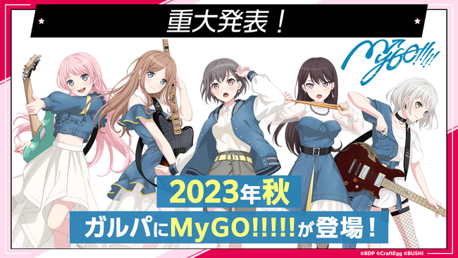 スマートフォンアプリの企画開発事業を展開する株式会社Craft Egg(本社:東京都渋谷区 代表取締役:森川 修一、以下、Craft Egg)と、株式会社ブシロード(本社:東京都中野区 代表取締役社長:木谷 高明、以下、ブシロード)の共同制作によるスマートフォン向けゲーム「バンドリ! ガールズバンドパーティ!」(以下、ガルパ)は、2023年6月27日(火)の公式生放送にて、2023年秋より新バンド「MyGO!!!!!」がゲーム内に登場することを発表いたしました。また、2023年6月29日(木)より放送開始のアニメ「BanG Dream! It’s MyGO!!!!!」を記念し、ゲーム内にてキャンペーンを開催することも発表いたしました。