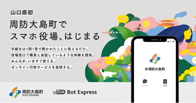 ほとんどの住民が、今、すぐに利用できるスマホ市役所「GovTech Express」を提供する株式会社Bot Express(本社:東京都港区、代表取締役:中嶋 一樹、以下 Bot Express)は、山口県周防大島町(町長:藤本 淨孝)がGovTech Expressを活用し、周防大島町LINE公式アカウントから行政手続きが可能となる「スマホ役場」を7月3日に開設することをお知らせいたします。