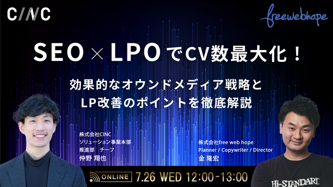 株式会社CINC(シンク、以下CINC)は、2023年7月26日(水)に 株式会社free web hopeとオンラインセミナー『SEO×LPOでCV数最大化!効果的なオウンドメディア戦略とLP改善のポイントを徹底解説』を開催いたします。