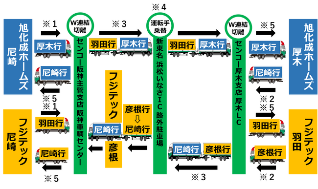 旭化成ホームズとフジテックが行う関西と関東の区間の配送について、センコーが提案するドリー式「ダブル連結トラック」を活用する新モーダルシフト運用を導入し、関西はセンコー阪神主管支店阪神車輌センターへ※1、関東はセンコー厚木支店厚木LCへ※2集約することで共同幹線輸送や中継輸送を行う仕組みです。大型車2台分の貨物を別々に集荷し、2台を連結してセンコーの拠点を出発します※3。関西拠点(尼崎市)と関東拠点(厚木市)のダブル連結トラックは、それぞれ高速道路等の長距離区間をドライバー1人が輸送、途中のダブル連結トラック用ドッキングステーション(浜松いなさIC)に設定した駐車場でドライバーが乗り替わり※4、連結を切り離すハブ設定拠点(下記図では尼崎市と厚木市)まで1人で輸送します。切り離し後、大型トラック(前荷台)、セミトレーラー(けん引荷台)の2台に分け※5、同時にそれぞれの配送先に向かいます。