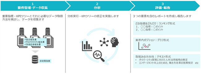 「どの指標がどれだけ効いているか」、「業界内のポジションはどこか」、「取組の方向性は何か」の3要素を含む報告書について作成いたします。