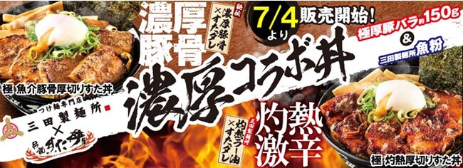 丼チェーン「伝説のすた丼屋」「名物すた丼の店」を運営する株式会社アントワークス(所在地:東京都杉並区、代表取締役:早川 淳)は、つけ麺専門店「三田製麺所」の運営を行う株式会社エムピーキッチン(所在地:東京都渋谷区、代表取締役:村上竹彦)とのコラボレーション商品として、2023年7月4日 (火)より『極 魚介豚骨厚切すた丼』『極 灼熱厚切すた丼』の2商品を全国の店舗(一部店舗を除く)にて期間限定で発売いたします。