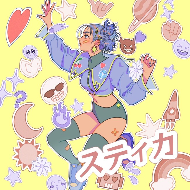 この楽曲から溢れる、ポップでピコピコしたかわいらしくもキレのある曲調と、勇気や励ましという名のステッカーを自分で貼る人/貼ってもらう人/貼ってあげる人、そんな強く優しい世界観を絵に落とし込みました。歌を聴いて、曲を聴いて、絵を見て楽しんで頂ければと思います。