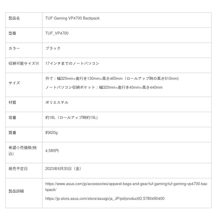 ASUS JAPAN株式会社は、スタイリッシュなデザインと機能性を兼ね備えたROG・TUF Gamingオリジナルバッグ5製品「ROG Ranger BP2701 Gaming Backpack (Cybertext Edition)」、「ROG Backpack BP1501G Holographic Edition」、「ROG BP4701 Gaming Backpack」、「ROG Sackpack」及び「TUF Gaming VP4700 Backpack」を発表いたしました。