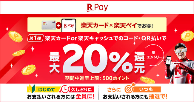 本キャンペーンでは、キャンペーン期間中にエントリーのうえ、「楽天ペイ」アプリで、「楽天カード」またはオンライン電子マネー「楽天キャッシュ」を支払い元に設定のうえコード払い(注1)で支払うと、最大20%の「楽天ポイント」が還元されます。「楽天ペイ」アプリではじめて・久しぶりに支払いする方には全員に、いつも支払いしている方にも抽選で1,000名に最大20%の「楽天ポイント」を還元します。