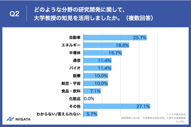 Q1で「何度もある」「数回程度ある」「一度だけある」と回答した方に、「Q2.どのような分野の研究開発に関して、大学教授の知見を活用しましたか。(複数回答)」(n=70)と質問したところ、「自動車」が25.7%、「エネルギー」が18.6%、「半導体」が15.7%という回答となりました。