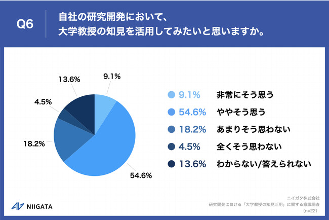 Q1で「一度もなく、検討したこともない」と回答した方に、「Q6.自社の研究開発において、大学教授の知見を活用してみたいと思いますか。」(n=22)と質問したところ、「非常にそう思う」が9.1%、「ややそう思う」が54.6%という回答となりました。