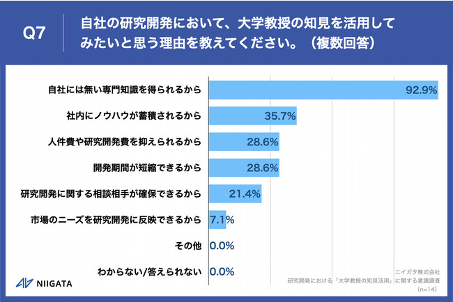 Q6で「非常にそう思う」「ややそう思う」と回答した方に、「Q7.自社の研究開発において、大学教授の知見を活用してみたいと思う理由を教えてください。(複数回答)」(n=14)と質問したところ、「自社には無い専門知識を得られるから」が92.9%、「社内にノウハウが蓄積されるから」が35.7%、「人件費や研究開発費を抑えられるから」が28.6%という回答となりました。