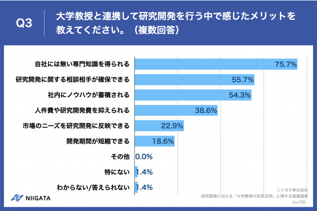 Q1で「何度もある」「数回程度ある」「一度だけある」と回答した方に、「Q3.大学教授と連携して研究開発を行う中で感じたメリットを教えてください。(複数回答)」(n=70)と質問したところ、「自社には無い専門知識を得られる」が75.7%、「研究開発に関する相談相手が確保できる」が55.7%、「社内にノウハウが蓄積される」が54.3%という回答となりました。