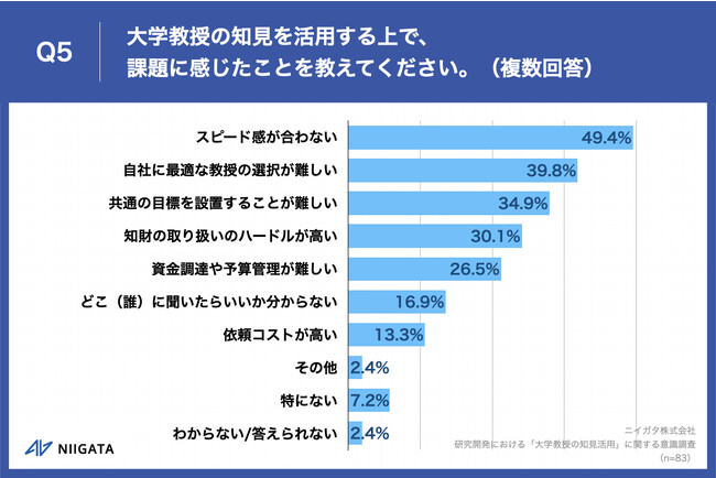 Q1で「何度もある」「数回程度ある」「一度だけある」「検討はしたが、一度もない」と回答した方に、「Q5.大学教授の知見を活用する上で、課題に感じたことを教えてください。(複数回答)」(n=83)と質問したところ、「スピード感が合わない」が49.4%、「自社に最適な教授の選択が難しい」が39.8%、「共通の目標を設置することが難しい」が34.9%という回答となりました。