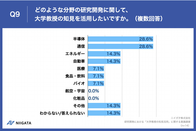 Q6で「非常にそう思う」「ややそう思う」と回答した方に、「Q9.どのような分野の研究開発に関して、大学教授の知見を活用したいですか。(複数回答)」(n=14)と質問したところ、「半導体」が28.6%、「通信」が28.6%、「エネルギー」が14.3%という回答となりました。