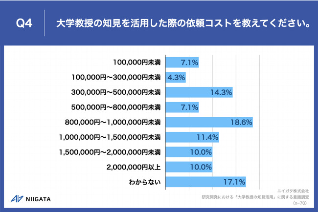 Q1で「何度もある」「数回程度ある」「一度だけある」と回答した方に、「Q4.大学教授の知見を活用した際の依頼コストを教えてください。※複数回ある場合は、平均を教えてください。」(n=70)と質問したところ、「300,000円~500,000円未満」が14.3%、「800,000円~1,000,000円未満」が18.6%という回答となりました。
