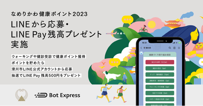 ほとんどの住民が、今、すぐに利用できるスマホ市役所「GovTech Express」を提供する株式会社Bot Express(本社:東京都港区、代表取締役:中嶋 一樹、以下 Bot Express)は、富山県滑川市(市長:水野 達夫)がGovTech Expressを活用し、「なめりかわ健康ポイント2023」において、滑川市LINE公式アカウントから健康ポイントの獲得やポイントが貯まった段階で参加記念品抽選への応募が可能となる取り組みを実施することをお知らせします。