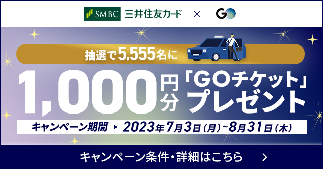 三井住友カード株式会社(本社:東京都江東区、代表取締役社長:大西 幸彦、以下:三井住友カード)は、GO株式会社(本社:東京都港区、代表取締役社長:中島 宏)が提供する、タクシーアプリ『GO』とタイアップキャンペーンを開始します。対象カードを『GO』アプリ内の決済機能「GO Pay」に登録し、「GO Pay」にてお支払いいただくと、抽選で5,555名様に1,000円分の「GOチケット」が当たるキャンペーンとなります。