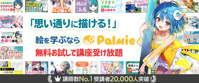 パルミーは、自宅に居ながらイラストやマンガの描き方が学べるオンライン教室です。著名クリエイターや漫画家、アニメーター、専門学校講師など、多くの「プロ」が講師を務めています。月額定額制(サブスク)で授業が受けられる「月謝制」は、累計利用者数20,000名を突破し、順調に利用者数を増やしています。