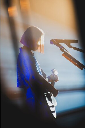 ここでバンドメンバーが一度退場して、ループペダルを駆使した一人パフォーマンスのコーナーへ。「足元が見たい。」というファンから寄せられたリクエストに応える形で、ループペダルをさばく足元を映すビジョンが登場し、フロアから大きな歓声が上がる。そして、「助手席に座って聴いてもらえれば。」と着席を促し、車の中の恋愛模様を描いた「Moonlight」へ。アコースティックギターのコード弾き、アルペジオ、高音フレーズ、そして、ボディを叩くスラム奏法によって鳴らされるパーカッシブなサウンドを一つずつ録音した上で、華麗なペダルさばきによってリアルタイムでトラックを生み出し、その上に彼女のメロウな歌声が重なっていく。たった一人の手によって成り立っているとは思えないほどの豊かさと迫力に満ちたパフォーマンスに何度も圧倒された。「SLEEP」では、音数を絞ったループトラックによって、彼女の細やかな息づかいを含めた繊細な歌唱表現が浮き彫りになり、「IDENTITY」における弾き語りパートと躍動的なロックアンサンブルのパートのコントラストの鮮やかさにも胸を打たれた。