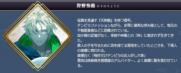 幼い頃に在野の天狗を名乗る男に拾われ、フリーの山伏となった金髪・緑銀眼の熱血系イケメン・狩野怜路。