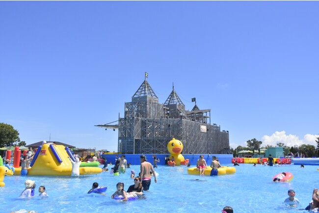 「ウォーターランドぷるぷる」は、すべり台などさまざまなフロートが浮かぶ広々とした空間で、子供から大人まで水遊びを満喫できる夏期限定の特設エリアです。