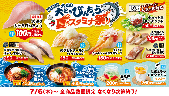 株式会社はま寿司(代表取締役社長:遠藤 哲郎 本社:東京都港区)が展開する100円寿司チェーン「はま寿司」は、7月6日(木)から、「はま寿司の大切り大とろびんちょうと夏のスタミナ祭り」を全国の店舗で開催します。