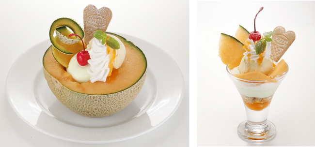 その他にも2つのアレンジを楽しんでいただける「三日月メロンのバニラアイス添え」や静岡県産のクラウンメロンのプリンを使用した「メロンプリン・ア・ラモード」、国産赤肉メロンを贅沢に半分使用した「ハーフメロンボート」をご用意しております。