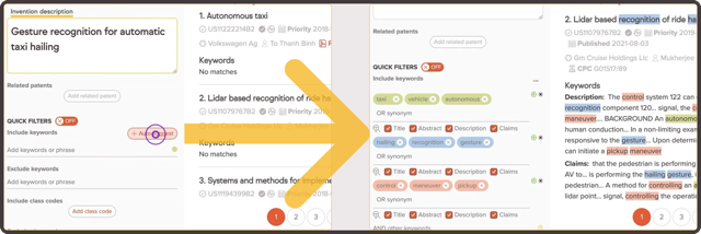 今回のリリースでは、キーワード提案機能と、特許文献要約機能がリリースとなる。キーワード提案は、検索によって類似性評価エンジンが収集した、利用者が興味を持つであろう特許群から、そこに含まれる技術的概念を推論し、キーワードレベルで提案する。利用者は特許情報とキーワードを参照して、あたかも人間とブレインストーミングをしているかのように、AIとともに発想を膨らませることができる。
