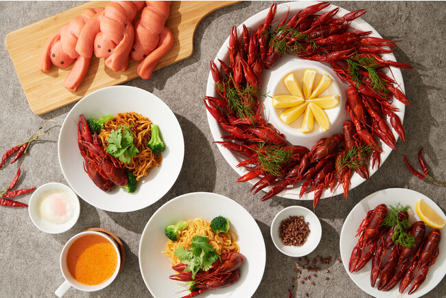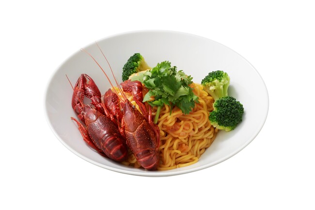 エビチリ風味のピリ辛ソースがかかった麺とザリガニを一緒に楽しめる一品です。
