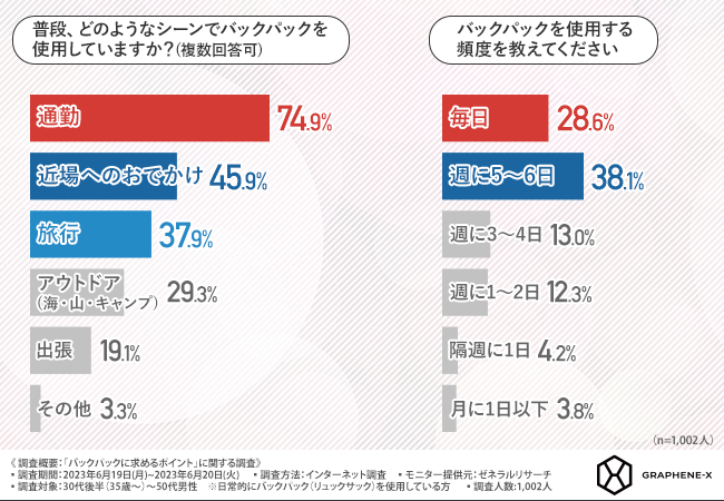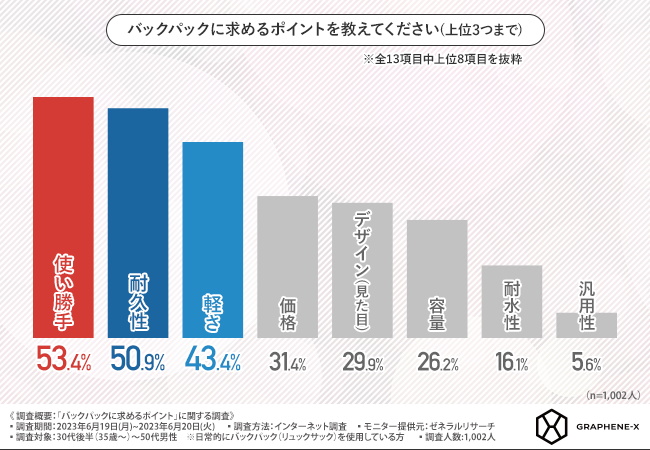 そこで今回、『GRAPHENE-X(https://graphene-xjapan.com/)』の日本総代理店である株式会社ユナイテッドは、普段からバックパックを使用する30代後半~50代男性を対象に、「バックパックに求めるポイント」に関する調査を実施しました。