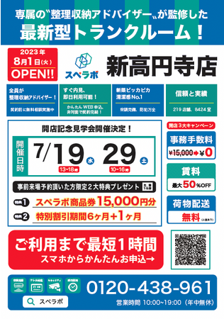 【新高円寺店/8月1日(火)オープン】見学から契約、解約まで完全非接触・非対面、お申し込みからご利用まで最短1時間!都内、大阪などにて絶賛運営中のトランクルーム【スペラボ】が新高円寺駅近くに出店!