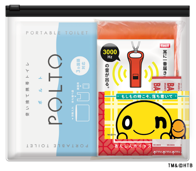 ■入っているアイテム:1.緊急用ホイッスル、2.静音アルミポンチョ、3.使い捨て携帯トイレ(大小兼用)、4.ポケットティッシュ(水溶性)、5.絆創膏(防水タイプ)、6.もしもの時の防災カード、7.そなえるHTB防災カード(HTBオリジナル)