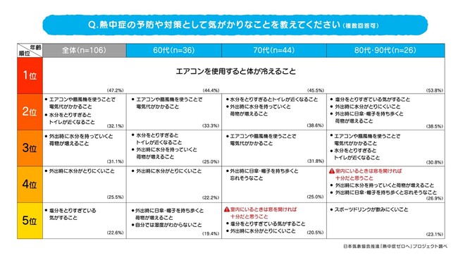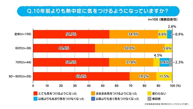 一般財団法人 日本気象協会(本社:東京都豊島区、理事長:渡邊 一洋、以下「日本気象協会」)が推進する「熱中症ゼロへ」プロジェクトは、60代以上の方106名を対象に熱中症に関する意識調査を実施しました。