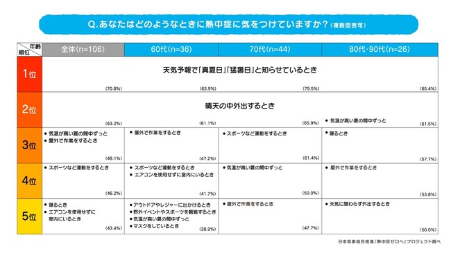 2. 熱中症に気をつけるのは『天気予報で「真夏日」「猛暑日」と知らせているとき』や『晴天の中、外出するとき』、80代・90代は『寝るとき』も上位に