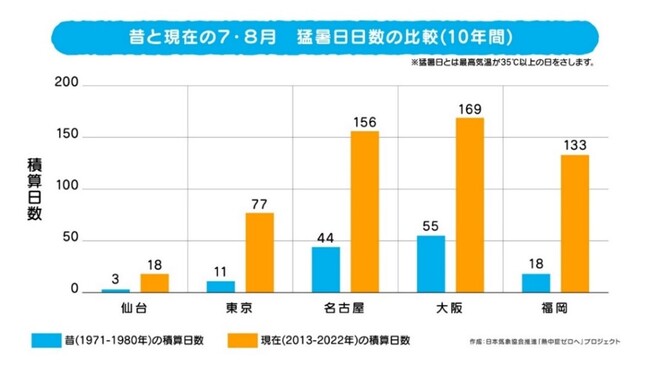 今回の調査では60代以上のおよそ9割の人が、10年前よりも熱中症に気をつけるようになったと回答しており、熱中症予防・対策意識が高まっていることが分かりました。昔と現在の7・8月の猛暑日日数の比較[参考資料2]にある通り、1971年から1980年、また2013年から2022年の各10年間で、最高気温が35℃以上となる「猛暑日」の積算日数を比べると、仙台、東京では昔の10年に比べて6~7倍の日数となりました。さらに名古屋、大阪、福岡では、いずれも現在の日数が100日を超えており、過去と比較して厳しい暑さとなる日が増加していることが分かります。現在60代以上の方が、約40年前に感じていた「夏」よりも、現在の「夏」は厳しい暑熱環境になっているといえます。