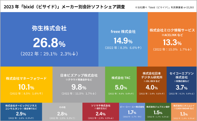bixid(ビサイド)内で最も多く利用されている会計ソフトメーカー第1位は昨年と変わらず、弥生会計を提供している弥生株式会社の26.8%(前年29.1%、前年比△2.3%)という結果になりました。
