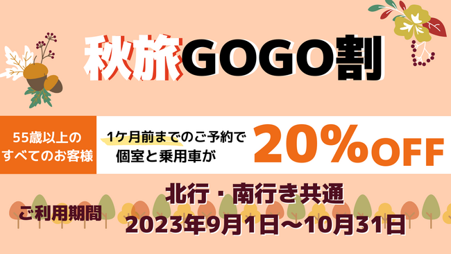 ご自宅からフェリー・観光地まで乗りなれたマイカーで移動できるフェリーで秋旅を満喫しませんか?行楽の秋、おトクに個室船室で快適な船旅を楽しむなら秋旅GOGO割!ご予約はご乗船の3ヵ月前から受付開始しており、秋旅GOGO割引の適用はご乗船の1ヵ月前までのご予約が対象となります。
