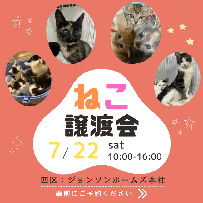(株)ジョンソンホームズ(本社:北海道札幌市西区、代表:山地 章夫)は、NPO団体ツキネコ北海道と共同で猫の譲渡会を開催いたします。
